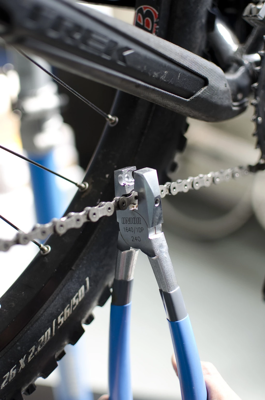 Unior kædeskillertangtil der bruges til let at skyde kædestiften ud af kæden.
